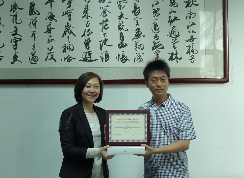 9月27日上午,有奖答题竞赛颁奖仪式在我校图书馆举行。图书馆馆长严潮斌和汤森路透公司吕宁女士为郭春颁发了奖状和奖品。严潮斌馆长首先对郭春同学表示祝贺,并对他严谨的求学态度和积极参与的热情表示赞赏,吕宁女士也感谢我校图书馆一直以来对SCI在线大讲堂的支持。郭春同学也表示要尽自己所能积极宣传并带动其他同学参与大讲堂,利用好图书馆的电子资源,为同学的科研提供帮助。