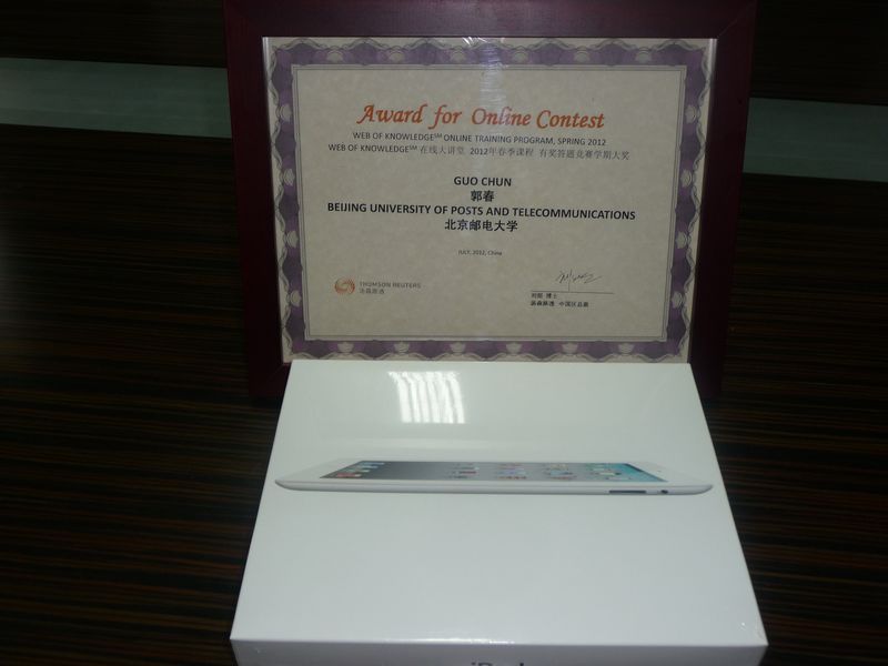 2012年春季SCI在线大讲堂于6月落下帷幕,该系列课程吸引了来自全国各地高校和科研机构的四万多名师生和科研人员的积极参与,我校计算机学院信息安全中心博士生郭春在众多参赛人员中脱颖而出,以满分的成绩喜获汤森路透“2012年春季SCI在线大讲堂有奖答题竞赛”一等奖!
