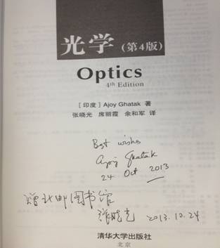 2013年10月29日我校信息光子学与光通信研究院张晓光教授将译作《光学》(第4版)1书1册赠予我校图书馆收藏。