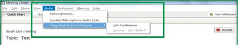 3.登入后点击左上角的Audio → Integrated voice conference → Joinconference,即可使用耳麦/耳机收听课程;