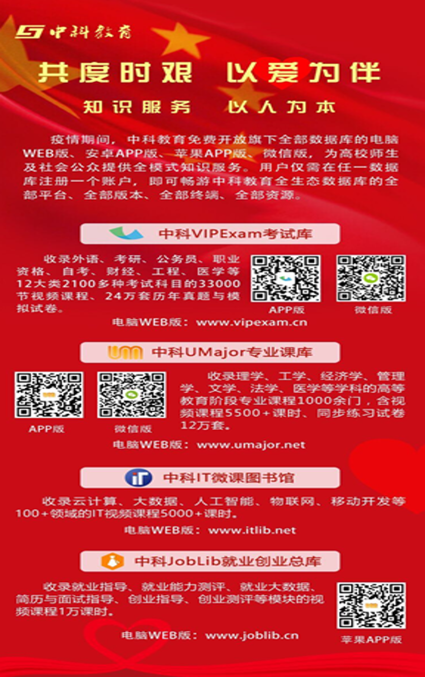 图书馆联合中科教育,面向我校师生免费开放旗下全部数据库,您只需在任一数据库注册一个账户,即可畅游中科教育全生态数据库的全部平台、全部版本、全部终端、全部资源,从而为您提供全模式知识服务。中科VIPExam考试库:收录外语、考研、公务员、职业资格、自考、财经、工程、医学等12大类2100多种考试科目的33000节视频课程、24万套历年真题与模拟试卷。