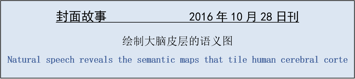 本期封面所示为一个实验对象的皮层表面,上面覆盖有被预测会在相应皮层位置引起特别强的反应的单词。单词颜色表示语义类别:例如,绿色单词大多是视觉和触觉概念,而红色单词大多是社会概念。白色线条描绘出了人们以前就知道的兴趣区域。