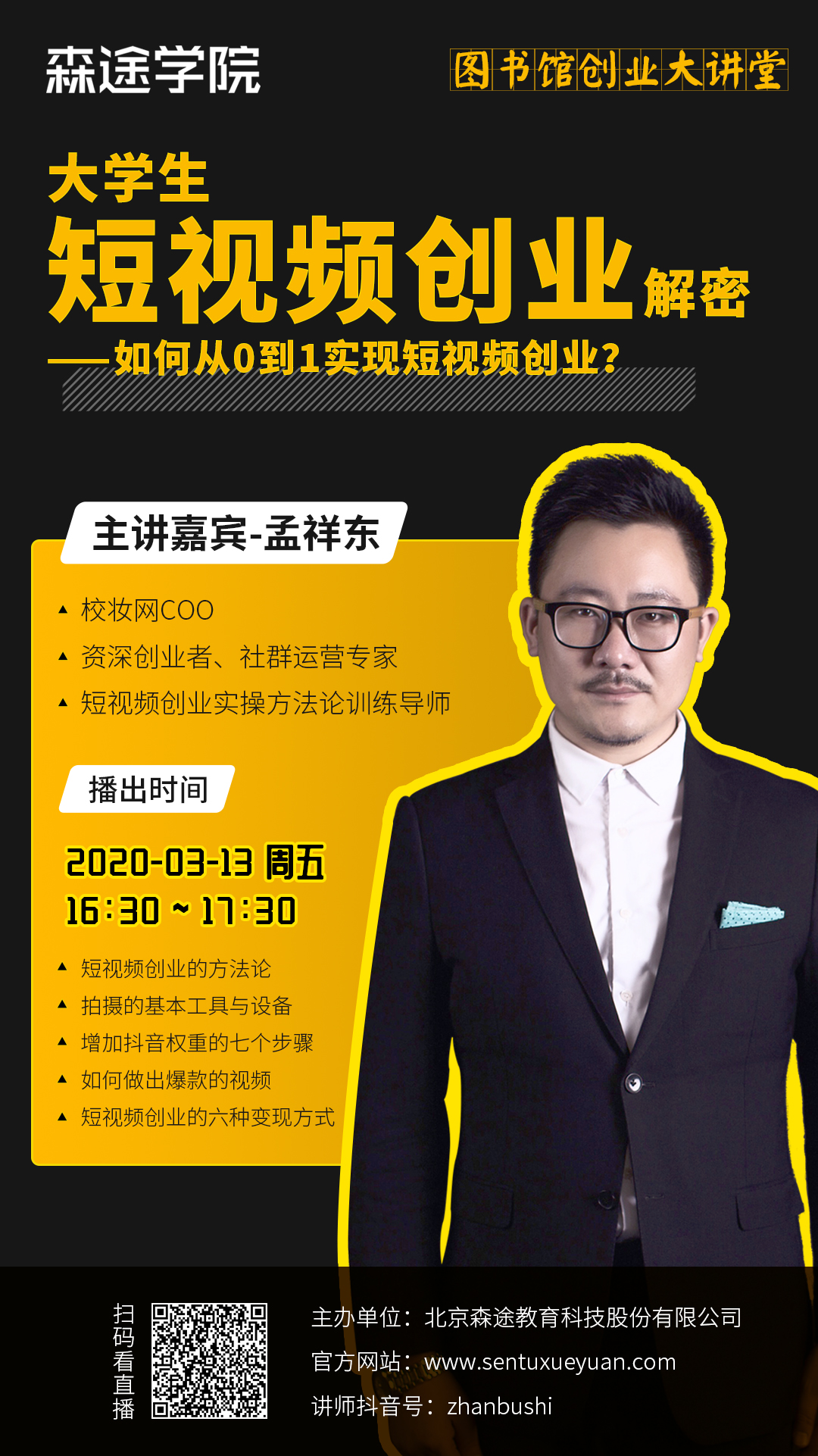 图书馆创业在线大讲堂开讲了!首场讲座题目为“大学生短视频创业解密——如何从0到1实现短视频创业”,欢迎广大师生参与。