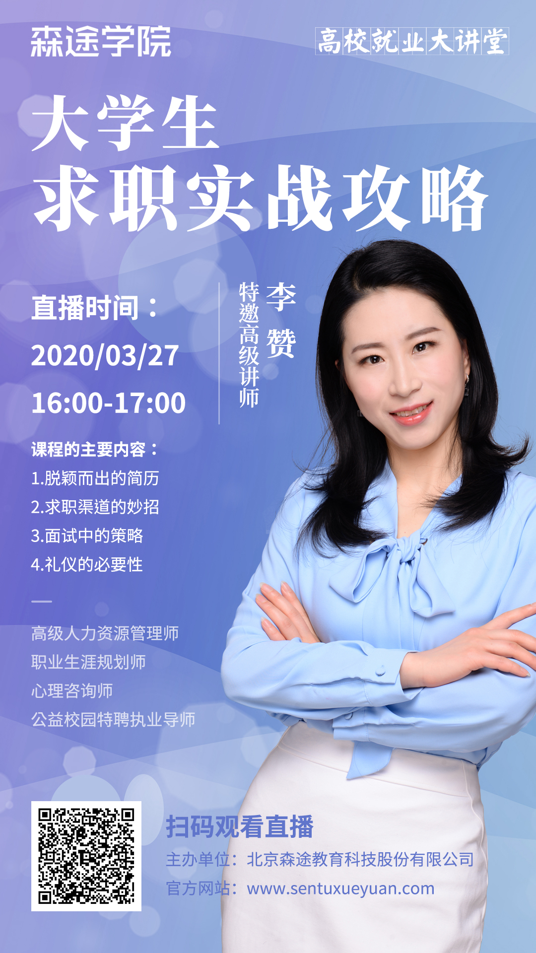 疫情期间,大学生求职面临着诸多困难,如何快速调整求职策略,找到心仪的职位?此次图书馆就业在线大讲堂邀请到高级人力资源管理师——李赞老师,通过线上直播的形式结合案例为大家详细解析大学生就业求职攻略。