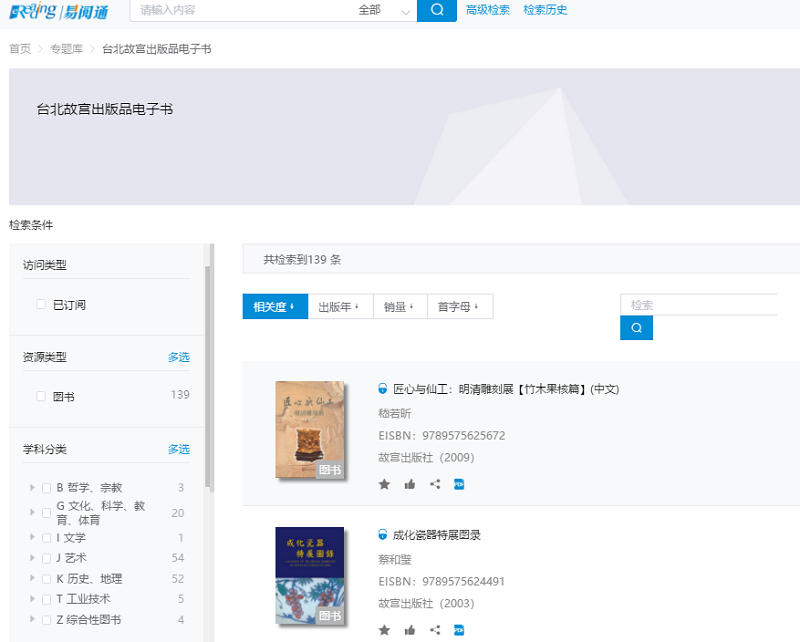 易阅通平台限时免费为我校师生开放139种台北故宫出品的电子书,内容涉及名画、铜器、织绣、瓷器,以及玉器、珍玩、图书、文献等各类珍稀文物,集华夏文物菁华,让您可以足不出户领略台北故宫国宝之美。