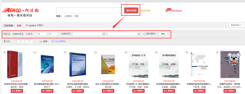 需要的图书直接加入购物车即可。系统还可根据图书的综合评分、出版时间、定价排序。也可按价格区间、出版时间段、重点图书进行筛选。