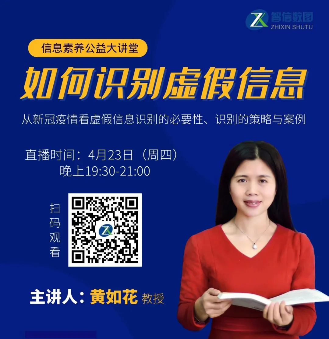 本周《信息素养公益大讲堂》讲述从新冠疫情看虚假信息设别的必要性,以及识别的策略和案例,教您如何识别真假信息。直播时间:2020年4月23日(周四)晚上19:30~21:00