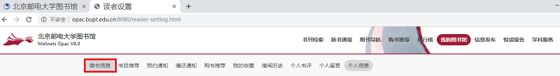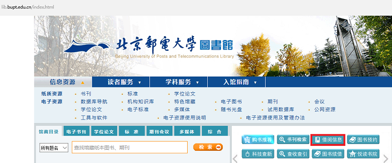 一、首先访问图书馆主页lib.bupt.edu.cn,点击“借阅信息”。