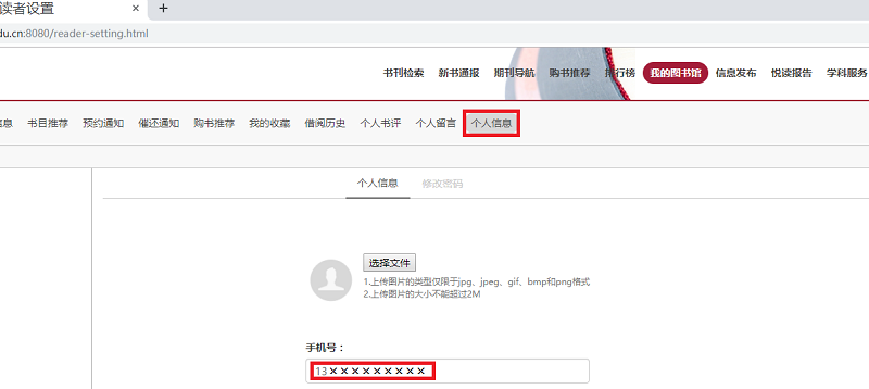 五、进入“我的图书馆”页面,请首先完善“个人信息”中的“手机号”,方便工作人员与您联系。
