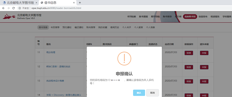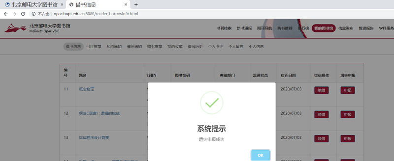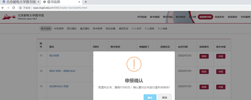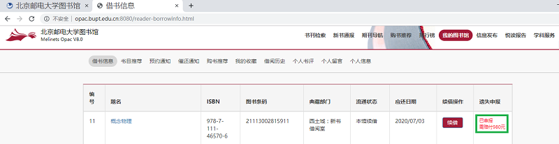 六、在“借书信息”里可看到所借图书若遗失需赔付的金额,如果选择线上申报遗失,请点击该册图书最右端的“申报”按钮。