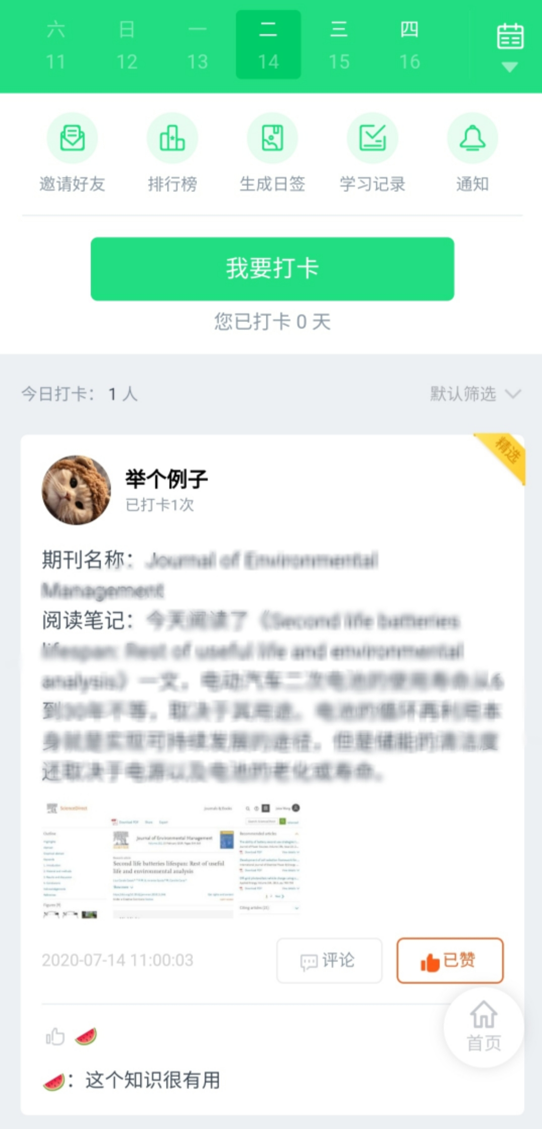 第三步:发送打卡内容。格式:1.文献标题,2.学习笔记/阅读心得,3. 带有用户本人登录状态的ScienceDirect阅读界面截图。点击“提交” ,完成一次打卡。