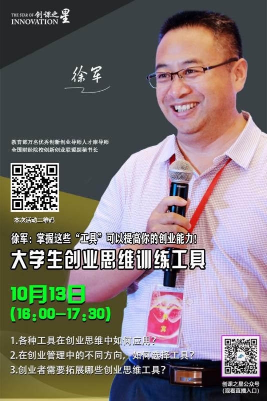 | 10月13日16:00-17:30 | 大学生创业思维训练工具 | 徐军 |