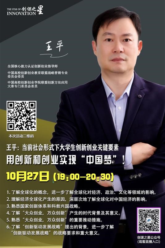 | 10月27日19:00-20:30 | 创新创业实践教育-用创新和创业实现“中国梦” | 王平 |