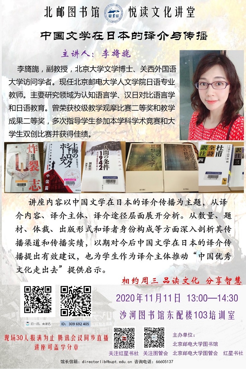 “悦读文化讲堂”是图书馆文化建设的重要品牌活动之一。本期讲堂,特邀请人文学院李旖旎副教授博士,为大家分享“中国文学在日本的译介与传播”。由于疫情影响,本期讲座现场限定30人,并通过“腾讯会议”网络平台进行同步直播,敬请关注!