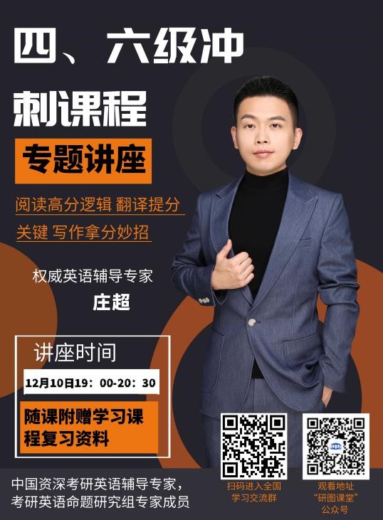 1、庄超:中国资深考研英语辅导专家,考研英语命题研究组专家成员,万学教育集团总部考研英语骨干教师,辅导成果卓越,考分80分以上学员累计1546人,学员最高分达到95分,独创“超式”阅读法先进解题模式,短期实现阅读34分高分。