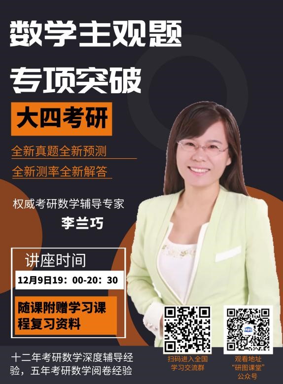 2、李兰巧:万学海文考研数学高端辅导体系创始人之一,十二年考研数学深度辅导经验,五年考研数学阅卷经验,深谙考研数学命题规律,历年考研考点与题型预测命中率全国最高专家之一。