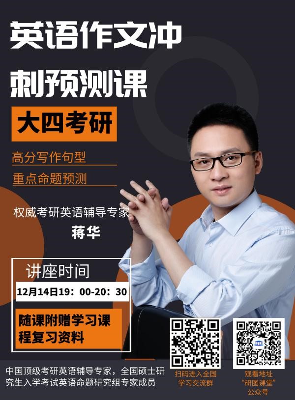 3、蒋华:中国顶级考研英语辅导专家,北大学霸,已发表10余篇教学领域学术论文、3本学术专著,全国硕士研究生入学考试英语命题研究组专家成员,12年考研英语教学经验直接影响超过50万学员,正式报名上课的12万余名学员中,56.3%考上理想的211院校,被誉为“211一哥”,连续5年押中英语作文题目。