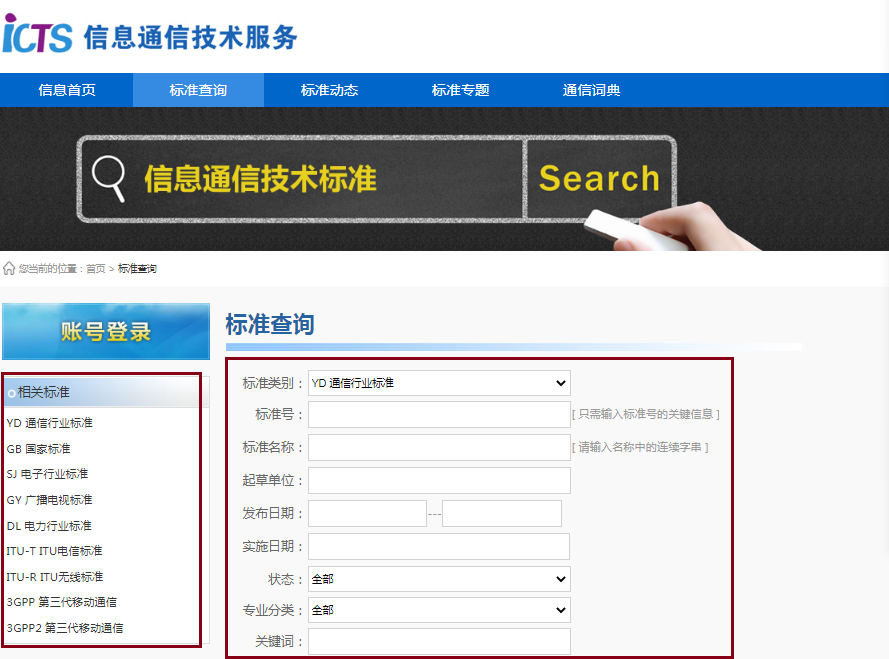2021年起,通信标准与质量信息网更名为ICTS信息通信技术服务网,原网址停用,新平台使用方法大致相同。该平台网站汇集了 YD、GB、ITU 等多类国内国外最具影响力信息通信技术标准,致力于为用户提供“简单、准确、专业”的智能标准检索服务。查找一个标准,可以在标准号搜索框内输入号码,也可以在标准名称搜索框内直接输入中文或英文名称,也可以在左侧根据“相关标准”类型浏览自己所需标准。文中带有“点击下载”标识表示该标准有全文。