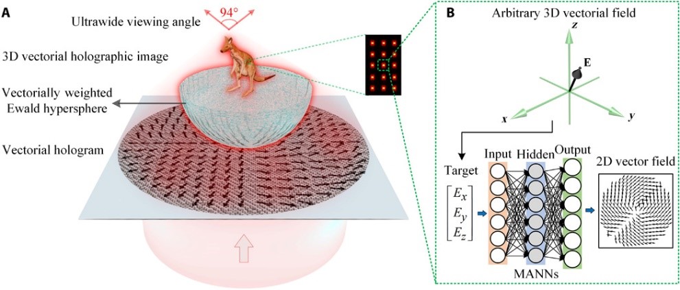 The three-dimensional (3D) vectorial nature of electromagnetic waves of light has not only played a fundamental role in science but also driven disruptive applications in optical display, microscopy, and manipulation. However, conventional optical holography can address only the amplitude and phase information of an optical beam, leaving the 3D vectorial feature of light completely inaccessible. We demonstrate 3D vectorial holography where an arbitrary 3D vectorial field distribution on a wavefront can be precisely reconstructed using the machine learning inverse design based on multilayer perceptron artificial neural networks. This 3D vectorial holography allows the lensless reconstruction of a 3D vectorial holographic image with an ultrawide viewing angle of 94 degrees and a high diffraction efficiency of 78%, necessary for floating displays. The results provide an artificial intelligence-enabled holographic paradigm for harnessing the vectorial nature of light, enabling new machine learning strategies for holographic 3D vectorial fields multiplexing in display and encryption.阅读原文 https://advances.sciencemag.org/content/6/16/eaaz4261.full