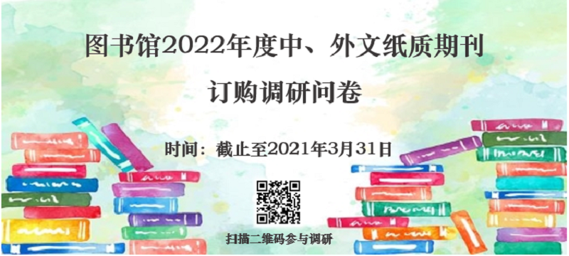 图书馆2022年度中、外文期刊订购工作即将开始,为丰富期刊品种、满足读者需求、更好地为广大师生服务,现向全校师生征求订购意见和建议。请老师和同学点击链接(https://www.wjx.cn/vj/r4UmK5h.aspx)或扫描二维码参与调研,调研截止时间为2021年3月31日。我馆2021年订购的中外文纸质期刊目录见附件,如您推荐期刊数量较多可直接发送电子版至联系人邮箱。