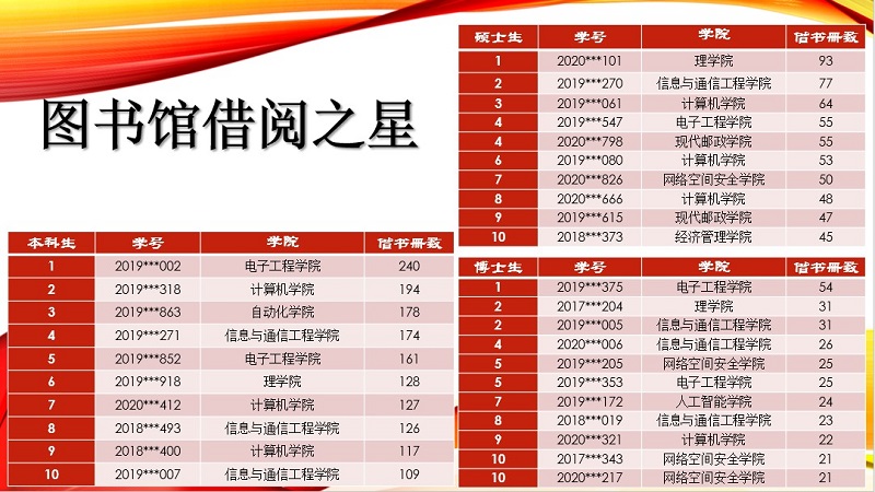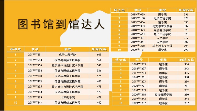 星光不问赶路人,时光不负实干者,你的每一份付出都将为你带来一份收获。2020年,图书馆统计了到馆达人,评选了借阅之星、预约达人,这些邮子们在图书馆留下了奋斗的足迹,快来看看其中有没有你身边的同学吧~