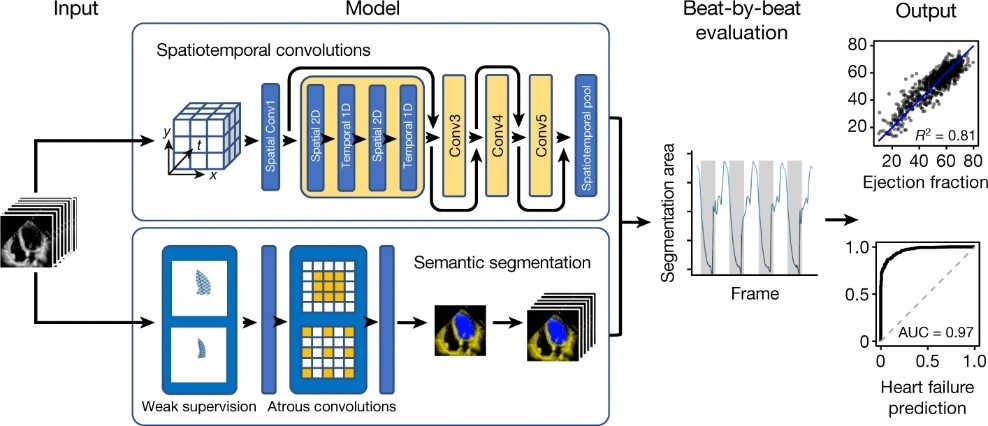 Accurate assessment of cardiac function is crucial for the diagnosis of cardiovascular disease, screening for cardiotoxicity and decisions regarding the clinical management of patients with a critical illness. However, human assessment of cardiac function focuses on a limited sampling of cardiac cycles and has considerable inter-observer variability despite years of training. Here, to overcome this challenge, we present a video-based deep learning algorithm-EchoNet-Dynamic-that surpasses the performance of human experts in the critical tasks of segmenting the left ventricle, estimating ejection fraction and assessing cardiomyopathy y. Trained on echocardiogram videos, our model accurately segments the left ventricle with a Dice similarity coefficient of 0.92, predicts ejection fraction with a mean absolute error of 4.1% and reliably classifies heart failure with reduced ejection fraction (area under the curve of 0.97). In an external dataset from another healthcare system, EchoNet-Dynamic predicts the ejection fraction with a mean absolute error of 6.0% and classifies heart failure with reduced ejection fraction with an area under the curve of 0.96. Prospective evaluation with repeated human measurements confirms that the model has variance that is comparable to or less than that of human experts. By leveraging information across multiple cardiac cycles, our model can rapidly identify subtle changes in ejection fraction, is more reproducible than human evaluation and lays the foundation for precise diagnosis of cardiovascular disease in real time. As a resource to promote further innovation, we also make publicly available a large dataset of 10,030 annotated echocardiogram videos.