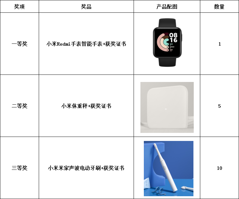 一等奖1名:小米Redmi智能手表+获奖证书;