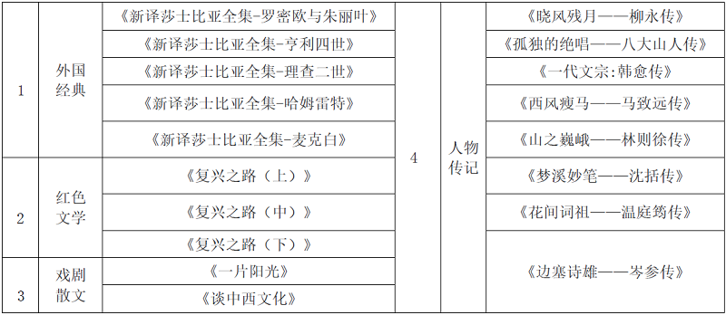 《一代文宗:韩愈传》《西风瘦马——马致远传》《山之巍峨——林则徐传》《梦溪妙笔——沈括传》《花间词祖——温庭筠传》《边塞诗雄——岑参传》