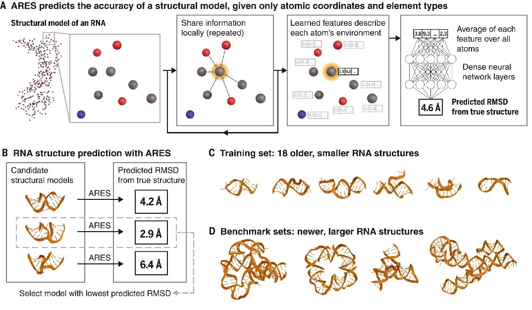 RNA molecules adopt three-dimensional structures that are critical to their function and of interest in drug discovery. Few RNA structures are known, however, and predicting them computationally has proven challenging. We introduce a machine learning approach that enables identification of accurate structural models without assumptions about their defining characteristics, despite being trained with only 18 known RNA structures. The resulting scoring function, the Atomic Rotationally Equivariant Scorer (ARES), substantially outperforms previous methods and consistently produces the best results in community-wide blind RNA structure prediction challenges. By learning effectively even from a small amount of data, our approach overcomes a major limitation of standard deep neural networks. Because it uses only atomic coordinates as inputs and incorporates no RNA-specific information, this approach is applicable to diverse problems in structural biology, chemistry, materials science, and beyond.