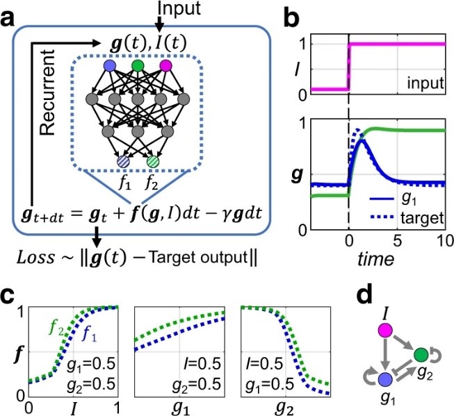 Searching for possible biochemical networks that perform a certain function is a challenge in systems biology. For simple functions and small networks, this can be achieved through an exhaustive search of the network topology space. However, it is difficult to scale this approach up to larger networks and more complex functions. Here we tackle this problem by training a recurrent neural network (RNN) to perform the desired function. By developing a systematic perturbative method to interrogate the successfully trained RNNs, we are able to distill the underlying regulatory network among the biological elements (genes, proteins, etc.). Furthermore, we show several cases where the regulation networks found by RNN can achieve the desired biological function when its edges are expressed by more realistic response functions, such as the Hill-function. This method can be used to link topology and function by helping uncover the regulation logic and network topology for complex tasks. Networks are useful ways to describe interactions between molecules in a cell, but predicting the real topology of large networks can be challenging. Here, the authors use deep learning to predict the topology of networks that perform biologically-plausible functions.