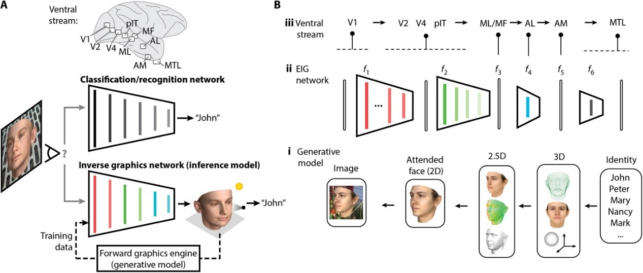Vision not only detects and recognizes objects, but performs rich inferences about the underlying scene structure that causes the patterns of light we see. Inverting generative models, or “analysis-by-synthesis”, presents a possible solution, but its mechanistic implementations have typically been too slow for online perception, and their mapping to neural circuits remains unclear. Here we present a neurally plausible efficient inverse graphics model and test it in the domain of face recognition. The model is based on a deep neural network that learns to invert a three-dimensional face graphics program in a single fast feedforward pass. It explains human behavior qualitatively and quantitatively, including the classic “hollow face” illusion, and it maps directly onto a specialized face-processing circuit in the primate brain. The model fits both behavioral and neural data better than state-of-the-art computer vision models, and suggests an interpretable reverse-engineering account of how the brain transforms images into percepts.