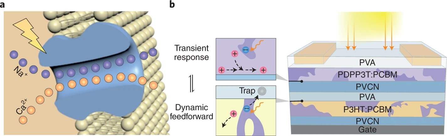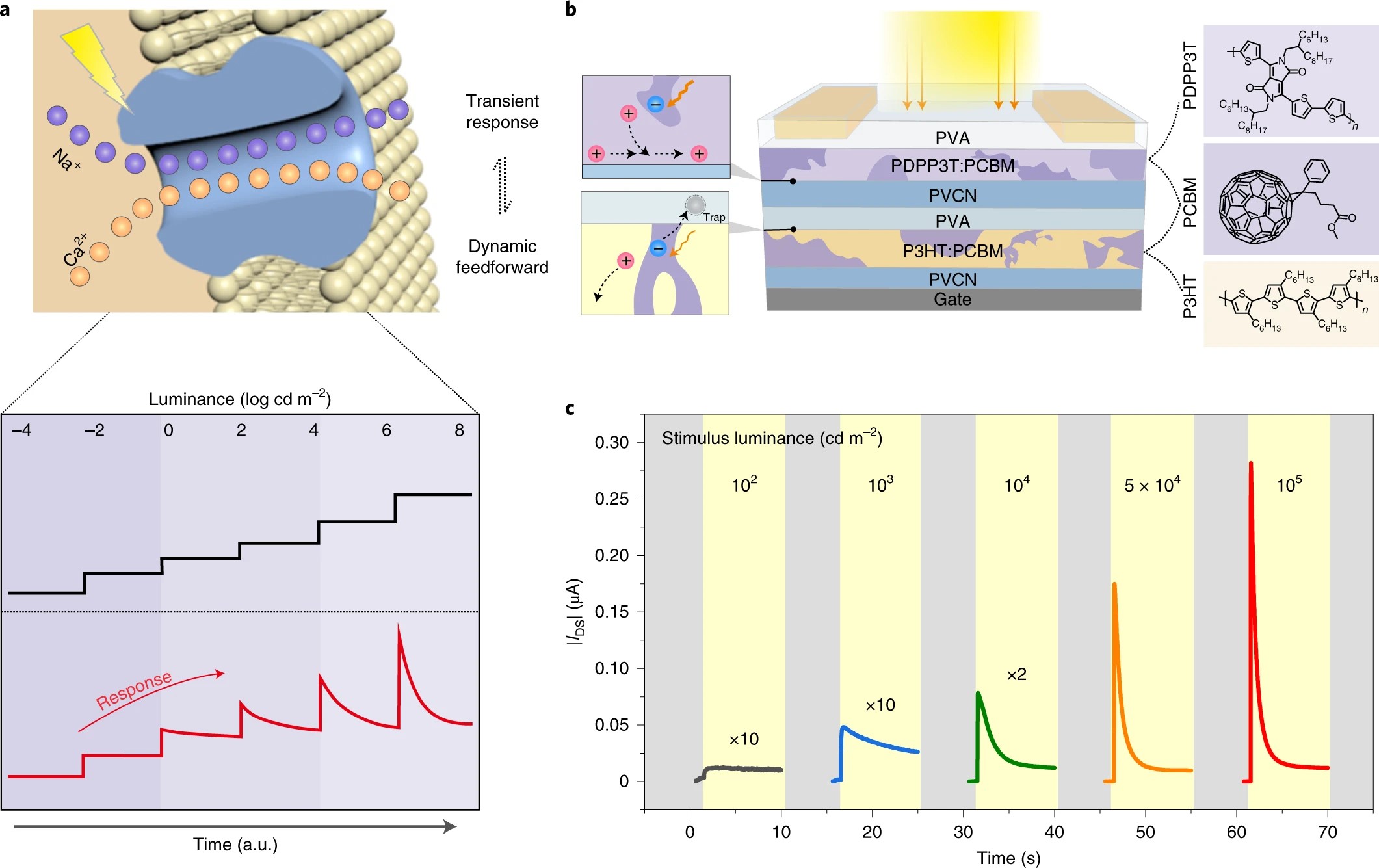 An organic phototransistor with two complementary bulk heterojunctions exhibits light-intensity-dependent adaptation behaviour that mimics the behaviour of the human visual system.
