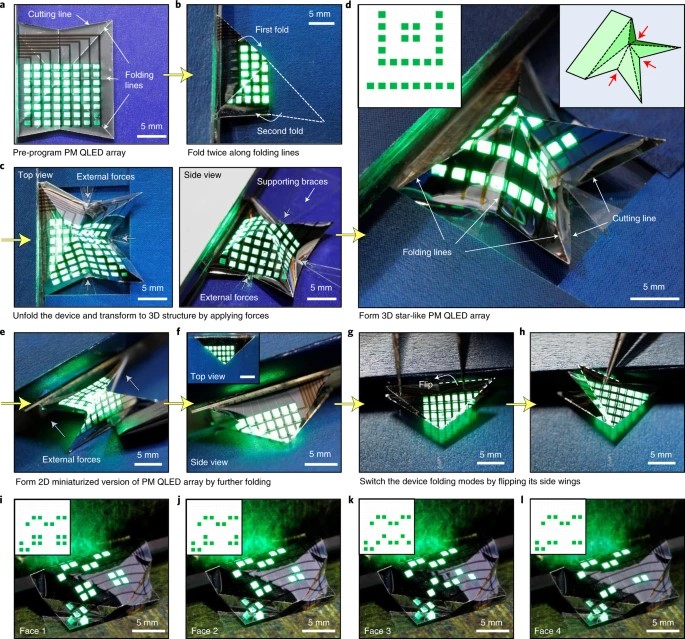 Fig. Dynamic 2D–3D transformation of the foldable PM QLED array
