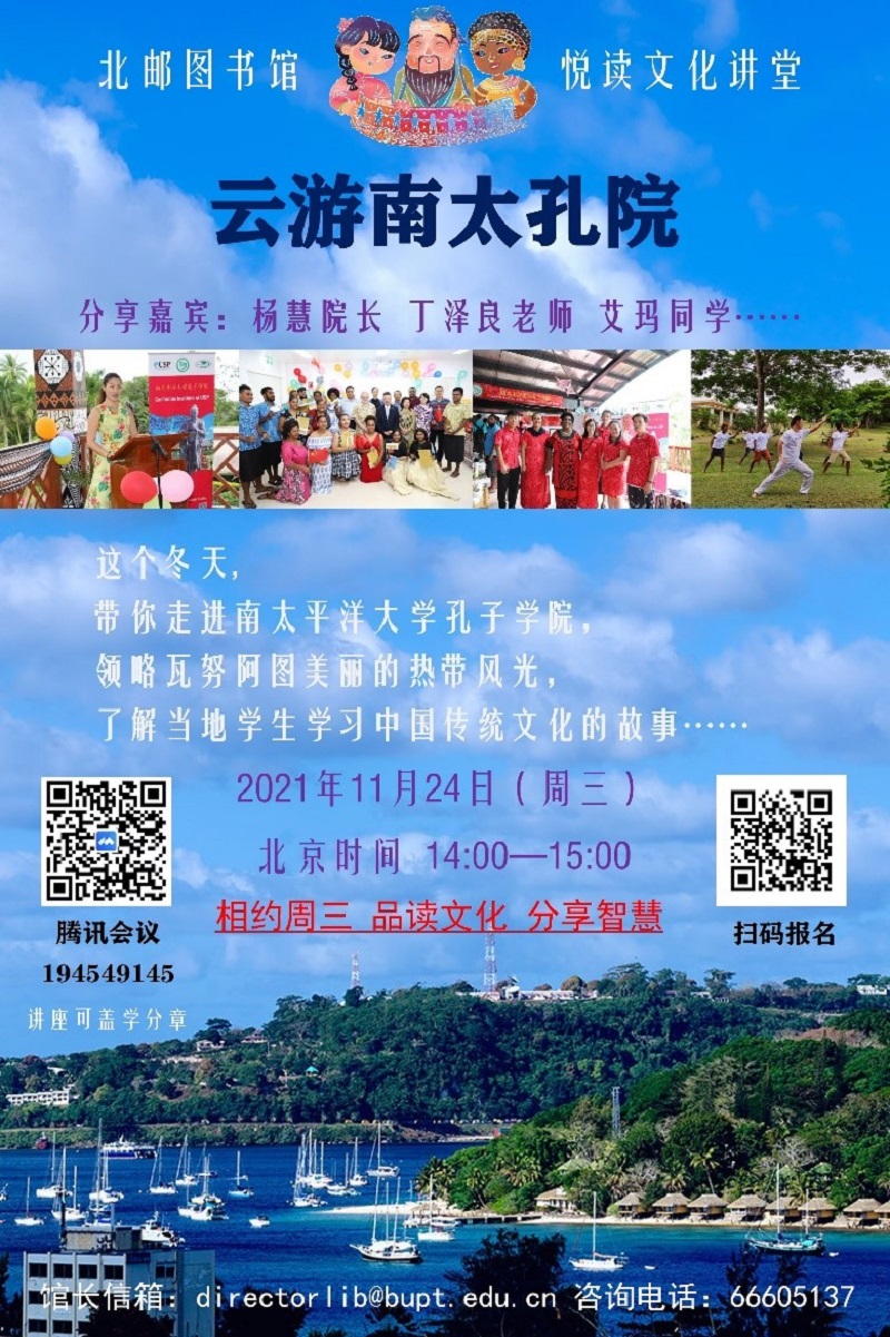 “悦读文化讲堂”是图书馆文化建设的重要品牌活动之一。本期讲堂,特邀南太孔院中方院长杨慧、丁泽良老师和艾玛同学,带大家一起“云游南太孔院”。