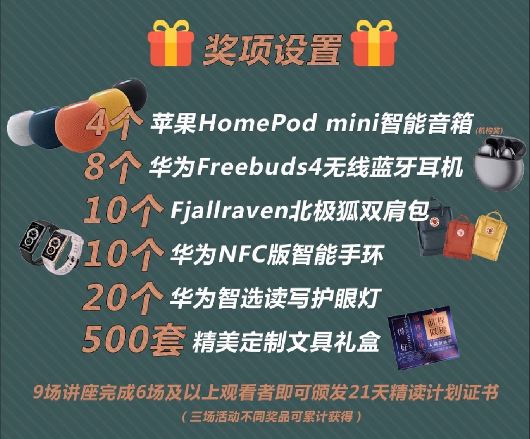 9场讲座完成6场及以上观看者即可颁发21天精读计划证书。根据观看时长筛选前200名同学奖励精美文具礼盒套装。奖项设置: