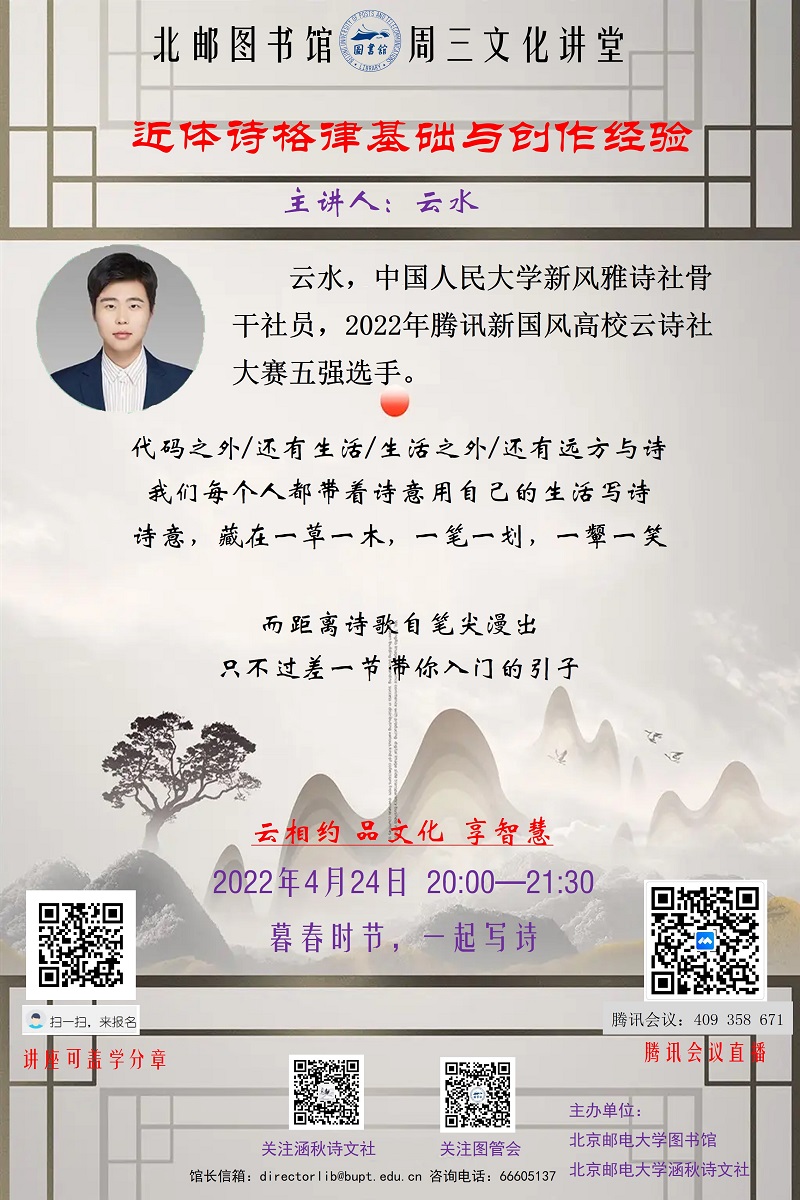 云水是新风雅诗社骨干成员,2022年腾讯新国风高校云诗社大赛五强选手。讲座将从基本规律、平仄规律和格律问题与拗救三个方面介绍近体诗的格律,同时分享对仗、理解、音韵、巧拙、层次等具体技巧问题。讲座同时选取部分近体诗作品一起赏析。