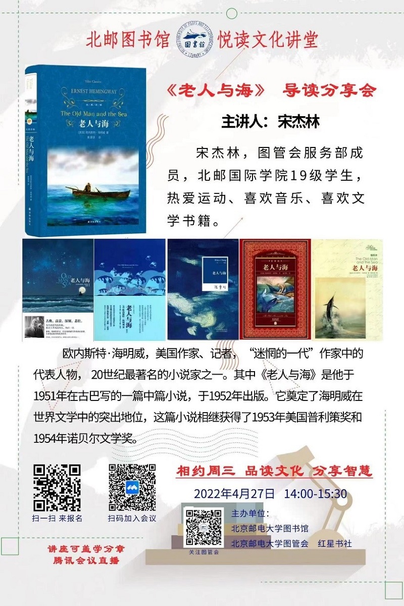 “悦读文化讲堂”是图书馆文化建设的重要品牌活动之一。北邮图管会服务部宋杰林同学将带领大家一起共读海明威的名作《老人与海》。