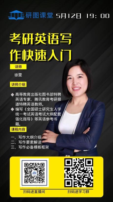 为助力大家考研各科备考的需要,北邮图书馆特联合高教网在线举办研图课堂系列讲座。5月12日我们特邀请徐雯老师为我们带来考研英语写作快速入门讲座。
