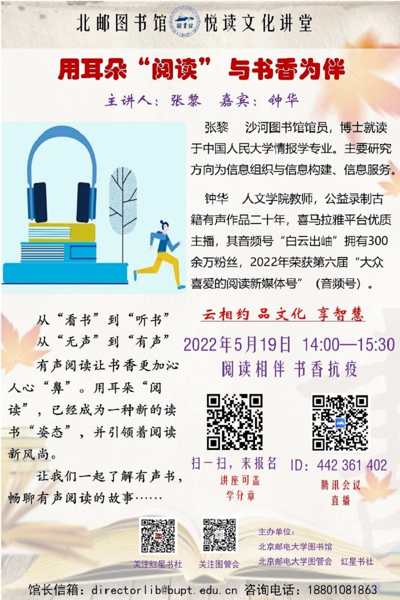 “悦读文化讲堂”是图书馆文化建设的重要品牌活动之一。图书馆张黎老师带来——用耳朵“阅读” 与书香为伴,一起了解有声书,畅聊有声阅读的故事!本次讲堂,还专门邀请了人文学院钟华老师作为嘉宾,带来喜马拉雅平台优质主播的别样分享。