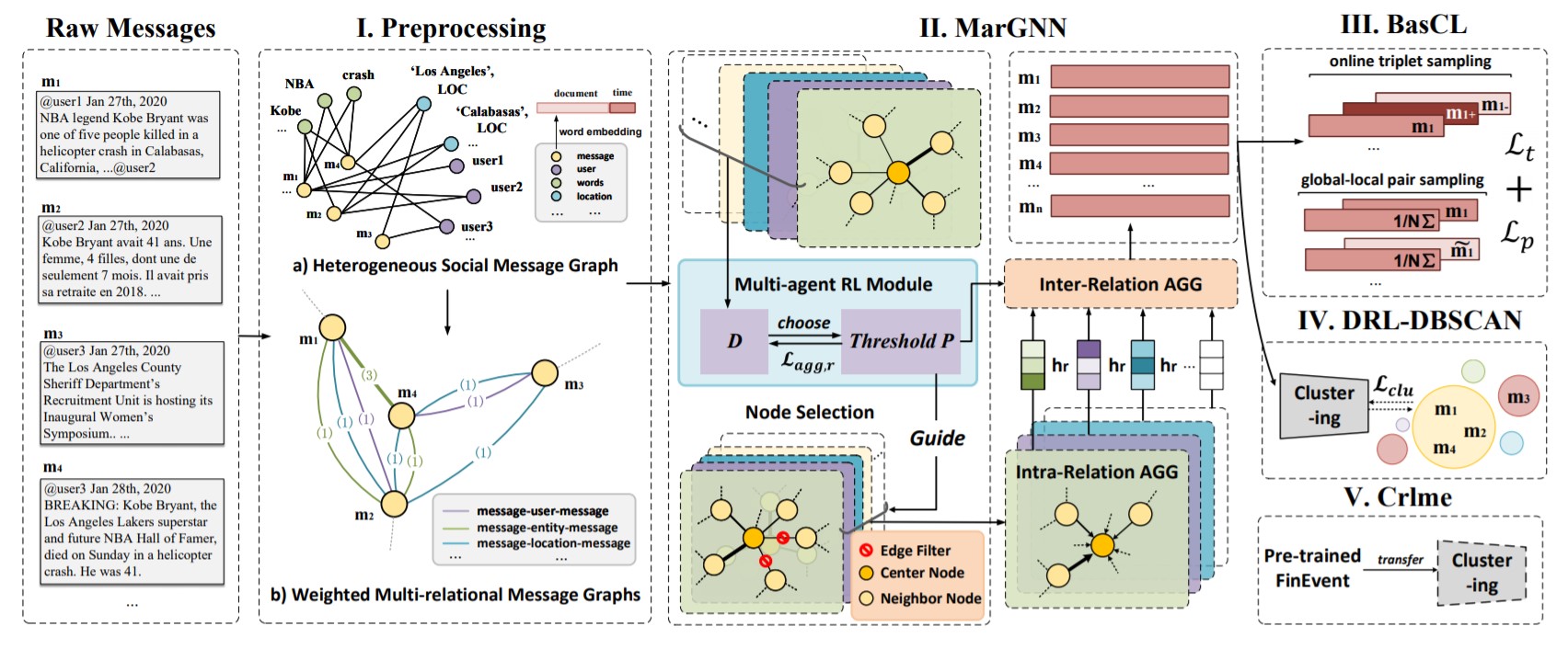 Detecting hot social events from social messages is crucial as it highlights significant happenings. However, the challenge is that the existing event detection methods are generally confronted with ambiguous events features, dispersive text contents, and multiple languages. In this paper, we present a novel reinForced, incremental and cross-lingual social Event detection architecture, namely FinEvent, from streaming social messages. Concretely, we first model social messages into heterogeneous graphs. Secondly, we propose a new reinforced weighted multi-relational graph neural network framework to select optimal aggregation thresholds to learn social message embeddings. To solve the long-tail problem, a balanced sampling strategy guided Contrastive Learning mechanism is designed for incremental social message representation learning. Thirdly, a new Deep Reinforcement Learning guided density-based spatial clustering model is designed to select the optimal minimum number of samples and optimal minimum distance between two clusters. Finally, we implement incremental social message representation learning based on knowledge preservation on the graph neural network and achieve the transferring cross-lingual social event detection. We conduct extensive experiments to evaluate the FinEvent on Twitter streams, demonstrating a significant and consistent improvement in model quality with 14%-118%, 8%-170%, and 2%-21% increases in performance on offline, online, and cross-lingual social event detection tasks.