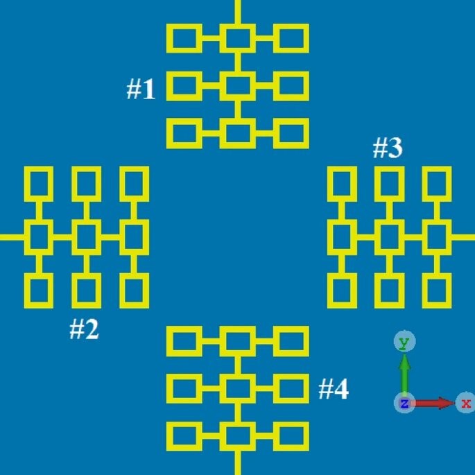 Fig. Top view showing the layout of the proposed antenna array consisting of four radiating elements with a standard ground plane.