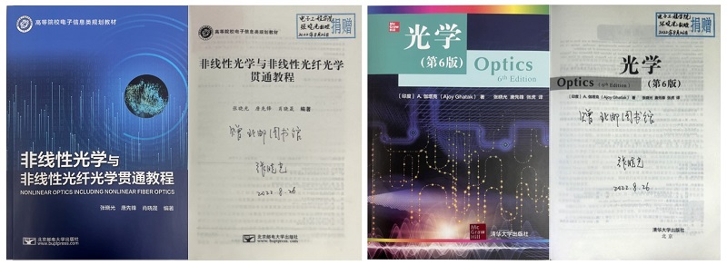 2022年8月26日,我校电子工程学院张晓光教授将他的个人著作《非线性光学与非线性光纤光学贯通教程》及译著《光学(第6版)》各一册赠与我校图书馆收藏。